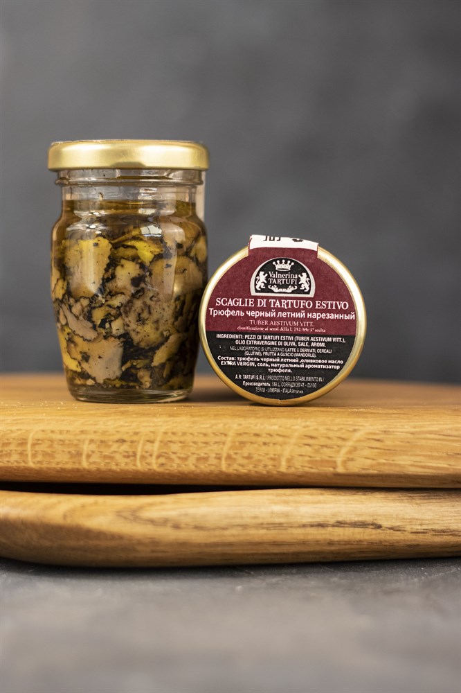 Тонконарезанные слайсы черного летнего итальянского трюфеля в оливковом масле. Всего несколько кусочков трюфеля сделают ваше блюдо изысканным.